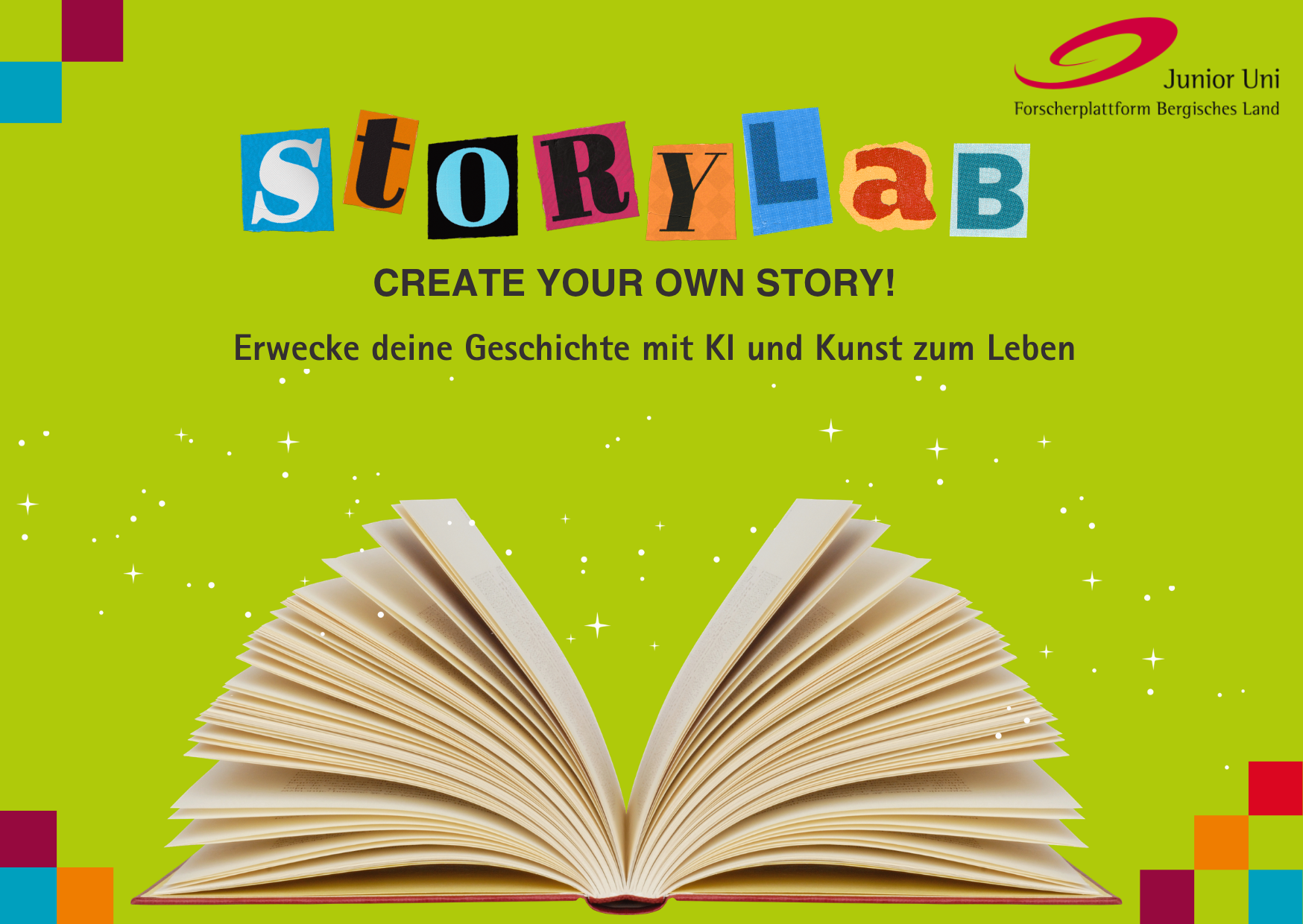 Am Samstag, 30. Mai, dreht sich hier in der Junior Uni alles um Bücher, Geschichten und visuelles Erzählen. Alles dreht sich um Stories, Bücher und coole visuelle Ideen. In vier verschiedenen Workshops kannst du selbst kreativ werden und neue Arten ausprobieren, Geschichten zu erzählen.